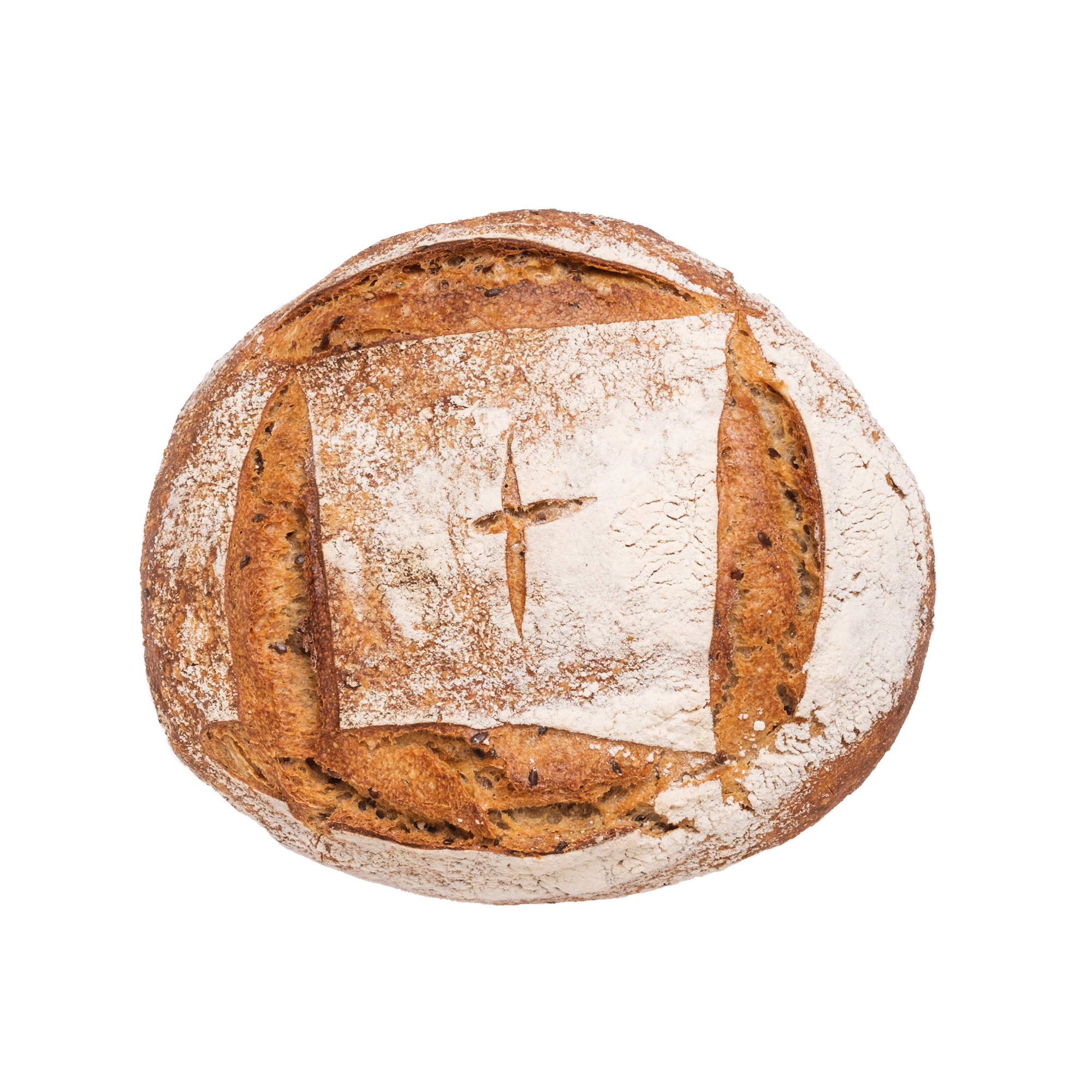 Pain de campagne à la croûte épaisse et à la mie légèrement alvéolée, agrémenté de graine de lin brun torréfiées.